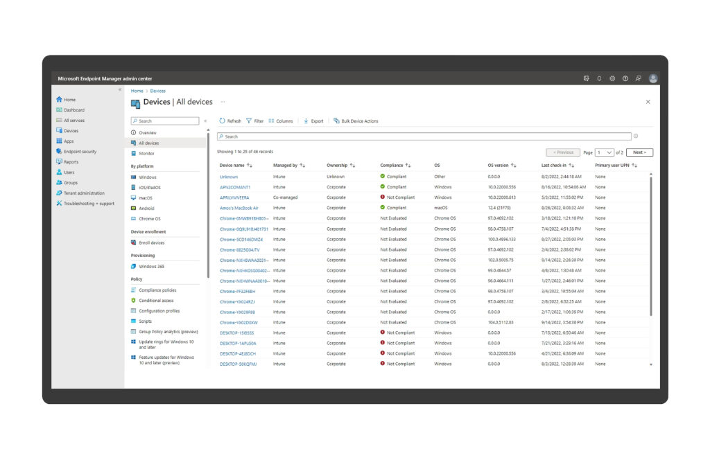 - Höhere Sicherheit bei der Endpunktverwaltung – mit Funktionen, die Sie beim Schutz von Unternehmensdaten und bei der Gerätekonformität unterstützen